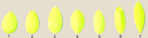 The sizes of spinner blades are based on a numerical system starting with 0 or 0/0, the smallest for stream trout spinners, size 3-4-5 for bass and pike up to the 7-8 for muskies along with the new popular magnum 10. The larger the blade size the more water resistance and vibration when compared to the same shape in a smaller version.